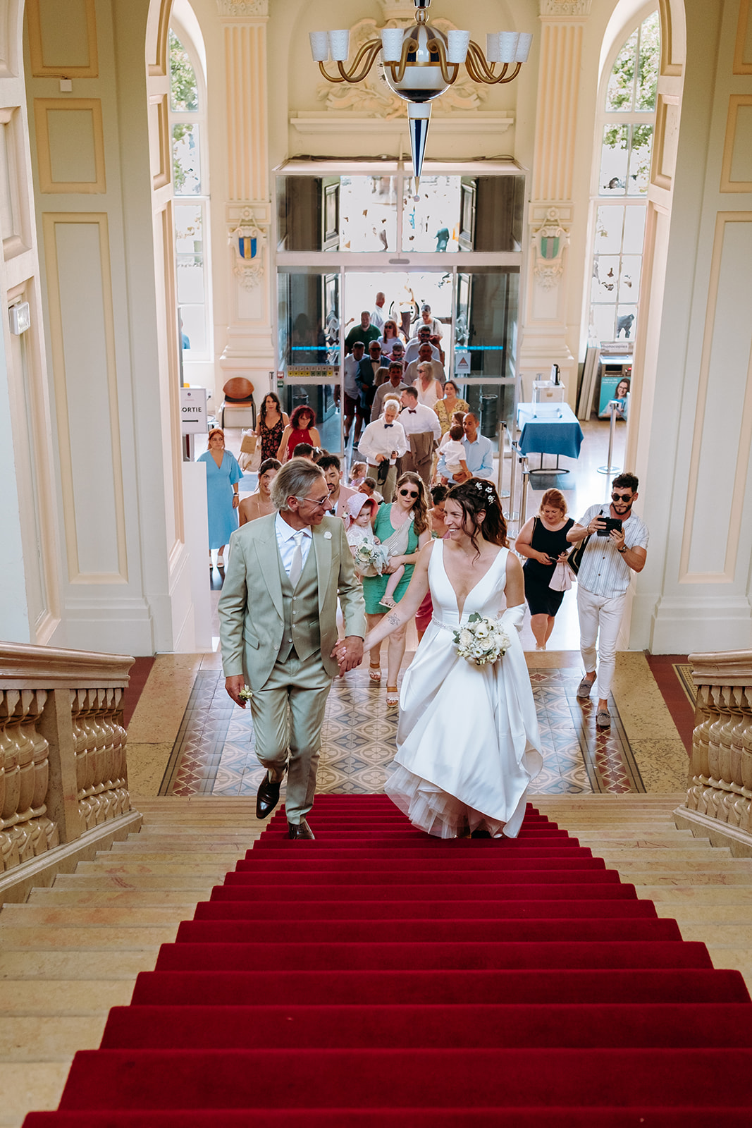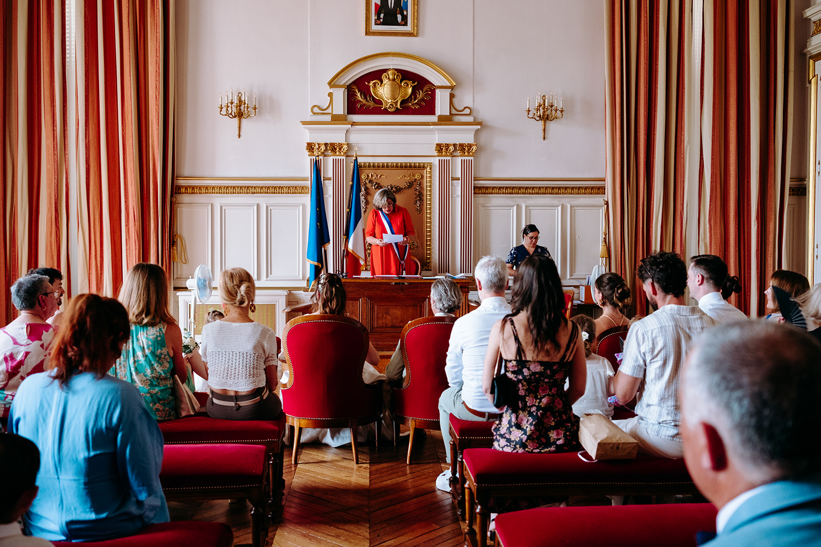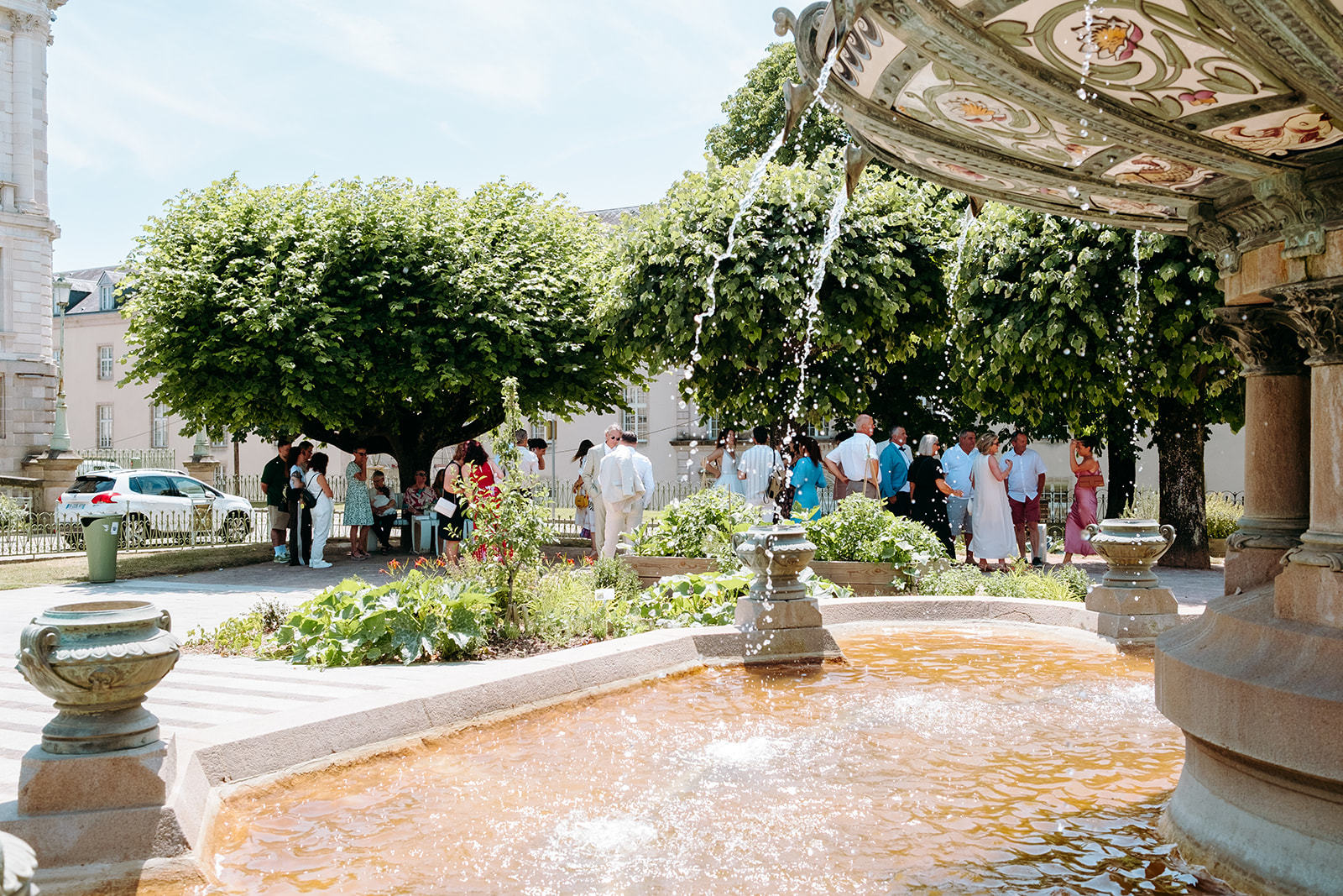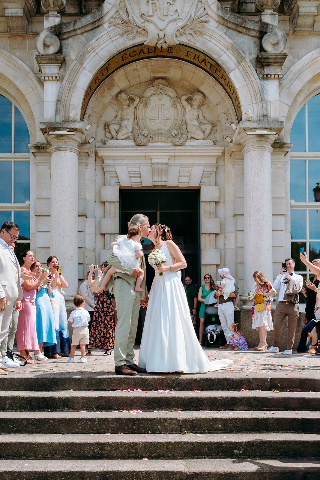 C’est à quelques kilomètres du Domaine du Vignau que la cérémonie civile a eu lieu, dans la magnifique mairie de Limoges. Les arbres ont été d’un grand secours face aux 38° affichés au thermomètre. Mon matériel a d’ailleurs souffert de cette chaleur excessive, et je suis heureuse d’avoir un bagage assez solide car il m’a fallu photographier en manuel exclusivement, les ISO automatiques étant dysfonctionnels à ce moment-là (je travaille en semi-manuel à tous mes reportages car j’aime maîtriser la lumière et la vitesse, seuls les ISO sont en mode auto pour être assez rapide dans mes réglages et ne pas louper un moment important).
